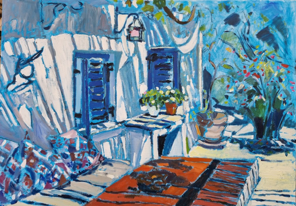Blue Shutters and Shadows, Alonnisos 2022, oil on canvas 70×50