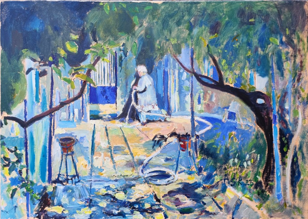 Lady watering a tree in her garden, in the afternoon sunlight, as viewed through her blue gate. Oil on Canvas 70×50 cms. Artemis area of mainland Greece (9km from Athens Airport)